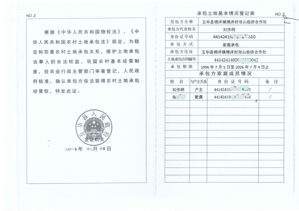 相关《中华人民共和国农村土地承包经营权证》显示,涉事农用地承包方代表为刘作纲。刘作纲方称,其兄弟刘作亮妻子曾足英因劝阻,现场被警务人员带走;12月22日,刘作纲妻子张运清、刘作纲方兄弟刘作岭妻子张幼梅,在己方农用地被违法硬化现场出示其《中华人民共和国农村土地承包经营权证》,合理劝阻,也被棉洋镇派出所带走。
