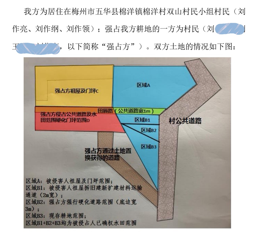 五华县棉洋镇棉洋村双山村民小组村民刘作纲、刘作亮、刘作岭(以下简称刘作纲方)反映情况称:其祖屋门前有一条上个世纪50年代开辟的田唇路(田唇路即当地所称耕地之间的分界小路),宽度为1米左右。10年前因祖屋拆旧建新,门前的田唇路无法运输建筑材料。于是他们采取了临时办法:将紧邻田唇路、己方承包经营的农用地部分农作物铲除,即将田唇路与部分农用地合并扩为宽度约3米的小路,便于运送建筑材料。