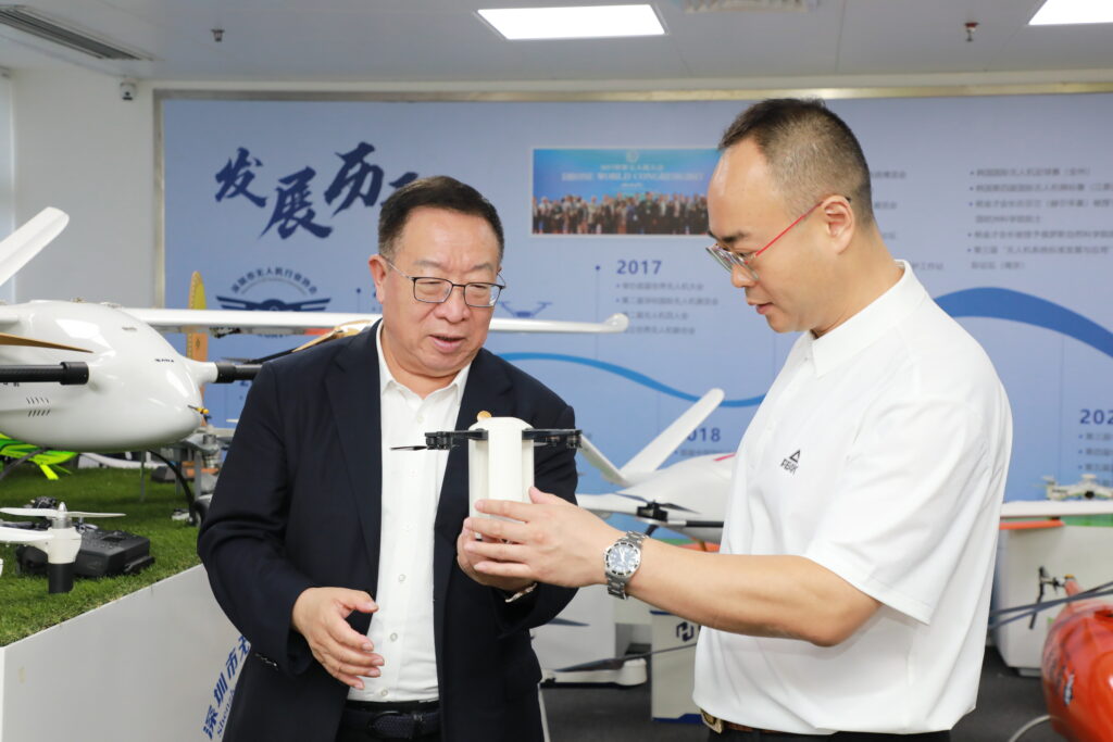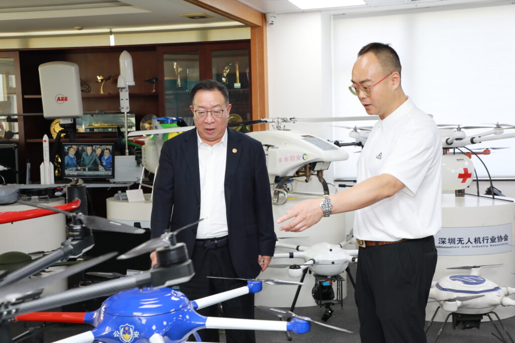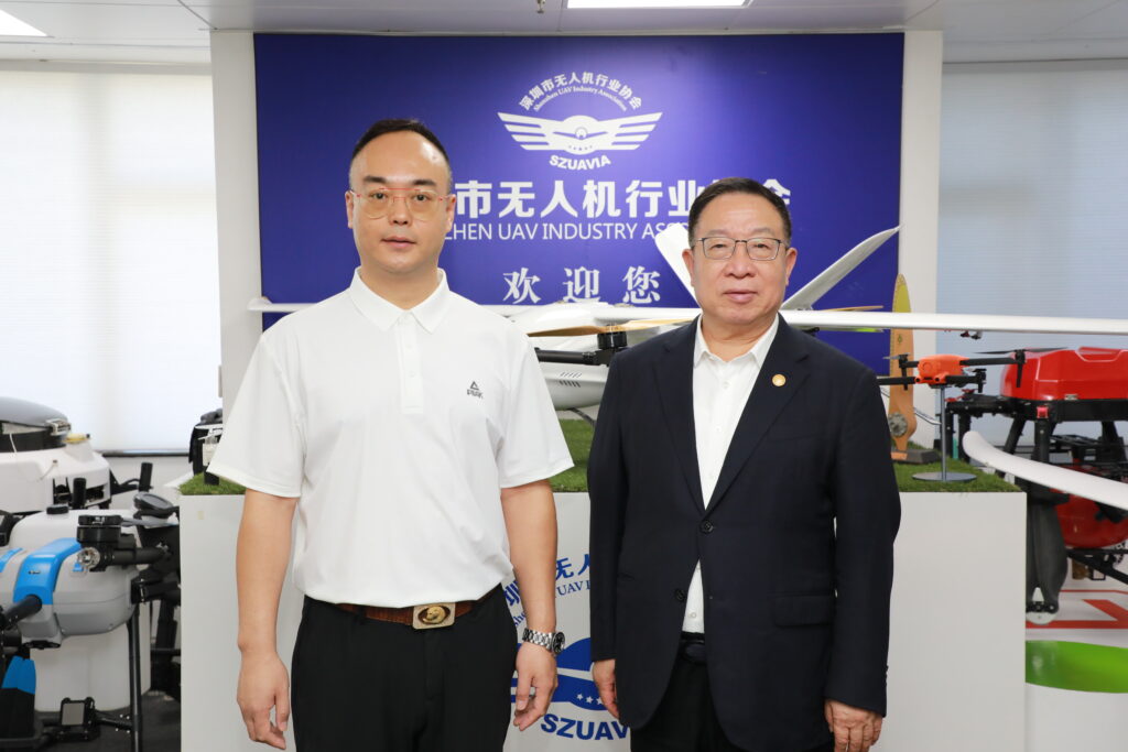 图说:为民办事栏目总编辑刘延春走访调研深圳市无人机行业协会,并与该协会创会会长、欧洲科学院院士杨金才合影留念。李春晓/摄影