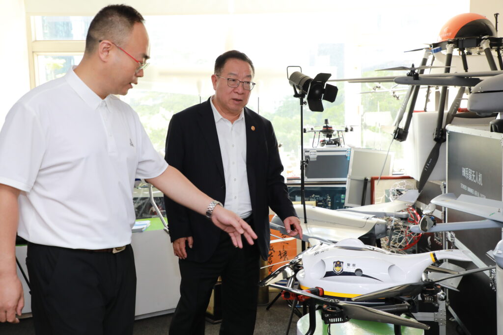 图说:为民办事栏目总编辑刘延春走访深圳市无人机行业协会,调研了解警用无人机等产品。李春晓/摄影