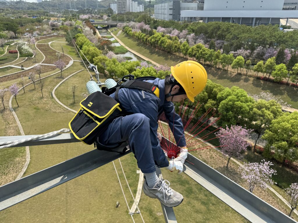 图说:南方电网深圳供电局输电管理所“女将”钱懿如正在杆塔上固定防鸟刺装置(摄/侯梦龙)