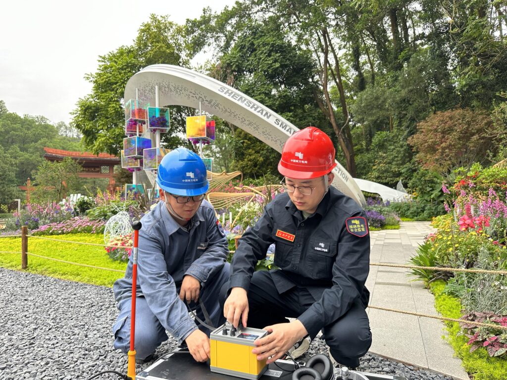 2023粤港澳大湾区花展期间,深圳罗湖供电局供电人员协助用户对植物园展区设备进行故障排查。钟彩平/摄影