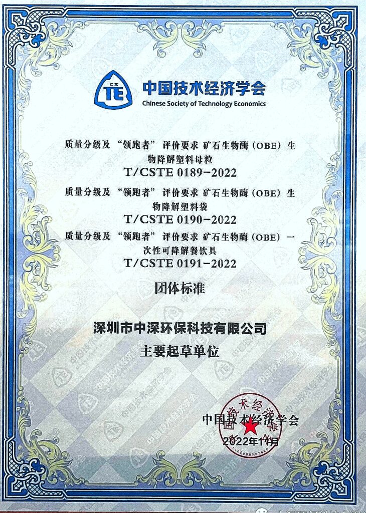 日前,中国技术经济学会批准了由中国科学院理化技术研究所、西北工业大学材料学院、中国标准化协会绿色低碳专业委员会、中国国际科技促进会绿色低碳发展专业委员会,以及深圳市尚昆集团旗下深圳市中深环保科技有限公司等单位和机构共同参与起草的《矿石生物酶(OBE)生物降解塑料母粒》《矿石生物酶(OBE)生物降解塑料袋》《矿石生物酶(OBE)一次性可降解餐饮具》三项团体标准,并正式向中深环保科技授予此三项团体标准的“领跑者”称号,颁发相关证书。