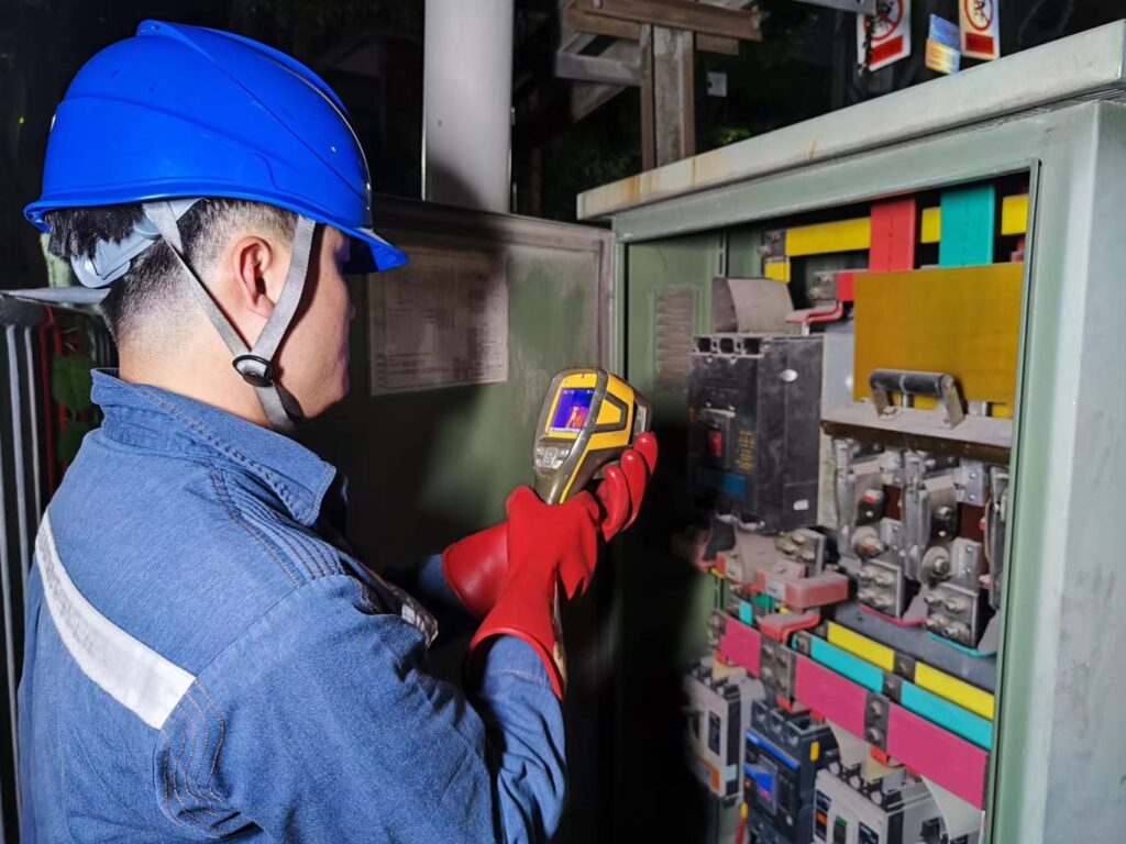 图说:南方电网深圳宝安供电局工作人员在居民用电高峰期对供电设备测温测流,如发现重载即安排调荷。杨诚/摄影