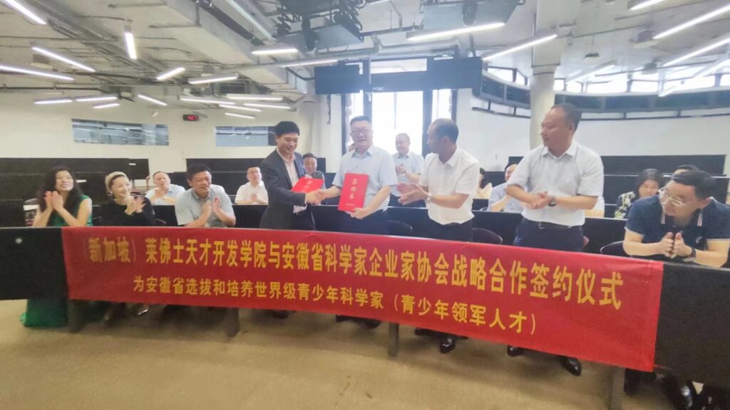 5月16日下午,安徽省科学家企业家协会与新加坡莱佛士天才开发学院举行了战略合作签约仪式。该会党委书记戴建华,副会长王本林、胡兴元、贾浩梅、朱长春、李斌商、程晋扩、吴仲华、张先亮、黄永强、李海军、韩斌,新加坡莱佛士天才开发学院执行院长胡海,南洋理工大学公共管理学院副院长王航,新加坡天才开发学院公共事务关系部(中国)部长杨菅娉、公共事务关系部(东盟) 部长赵晶,纳斯达克(中国金融中心)海外上市经理中国最佳SPAC 导师 Dr.Michelle shen等出席仪式。