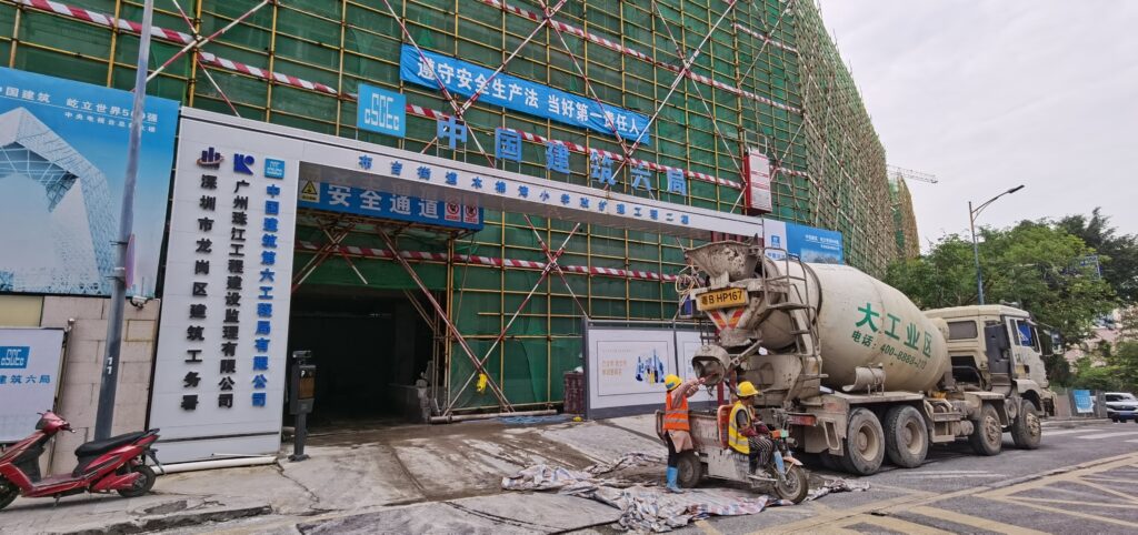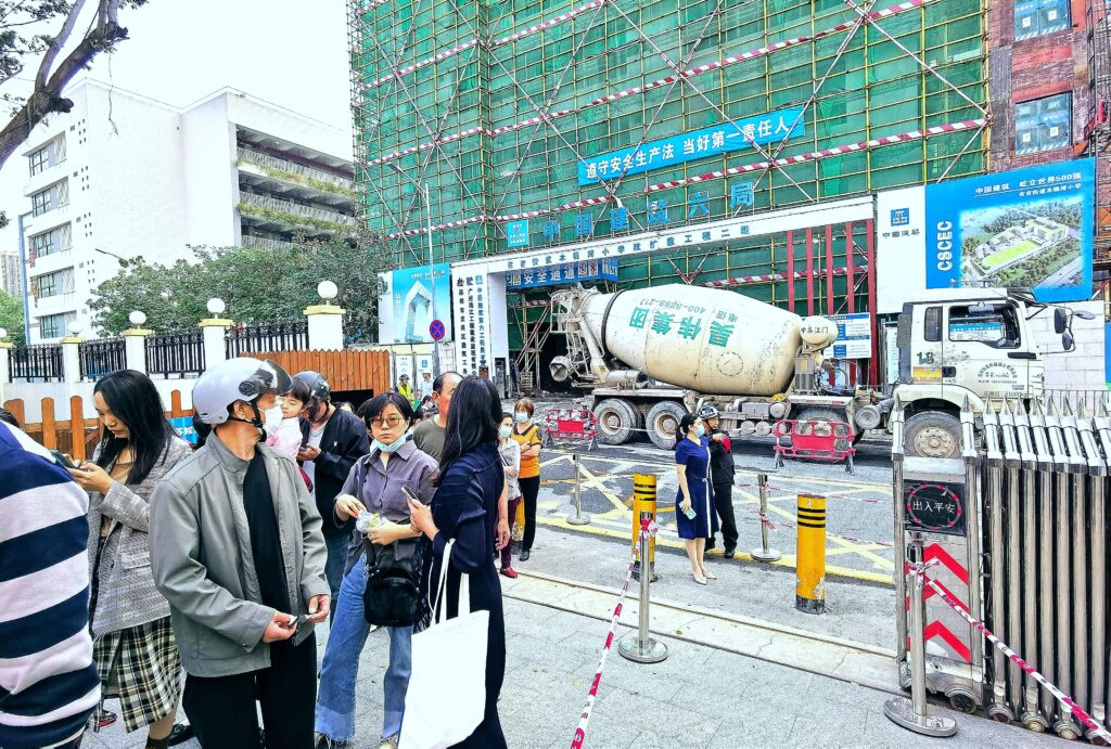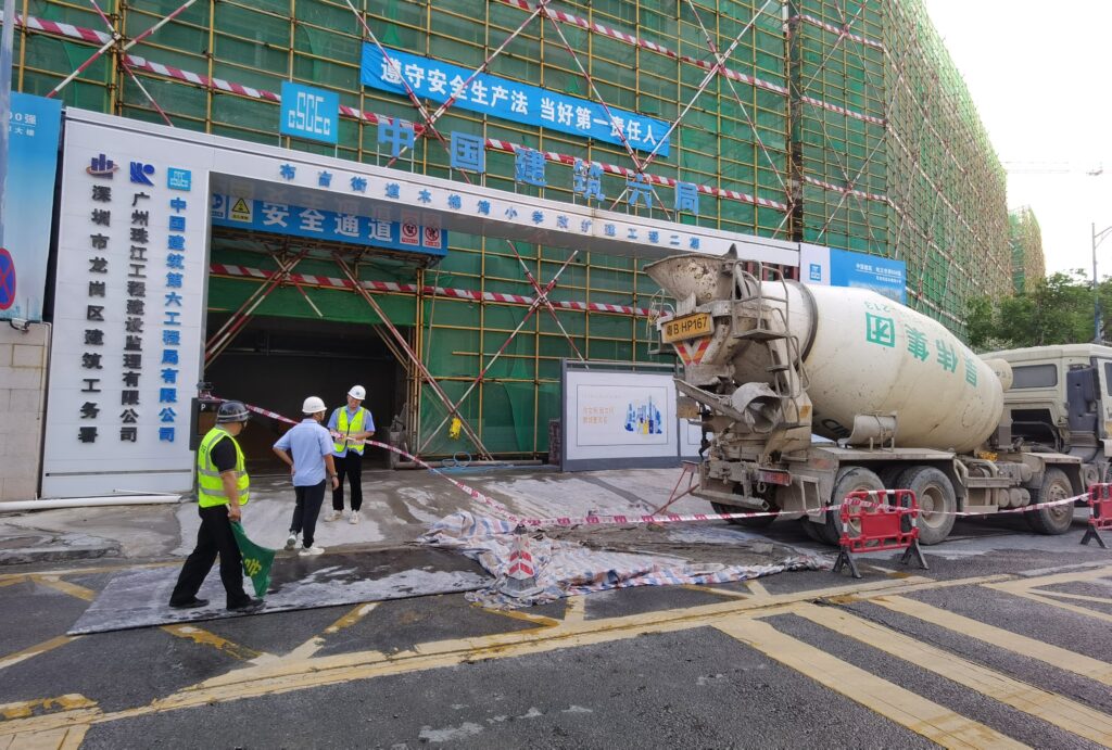 涉事工地为布吉街道木棉湾小学改扩建工程(二期)。该工地与华中师范大学龙岗附属中学(集团)木棉湾学校(以下简称木棉湾学校)衔接、紧邻,位于北侧。工地外墙工程简介显示建设单位为深圳市龙岗区建筑工务署,施工单位为中国建筑第六工程局有限公司。现场可以看到,该工地大门口人行道及机动车道停着一辆混凝土搅拌车,有工人正在作业。混凝土搅拌车占据了育苗路这条双车道的南向通行,使得育苗路在此变成了单车道;搅拌车上空,不时有装满泥浆的吊桶在工地内部和路边搅拌车之间滑动、运输、作业。