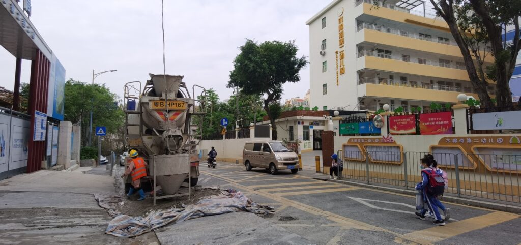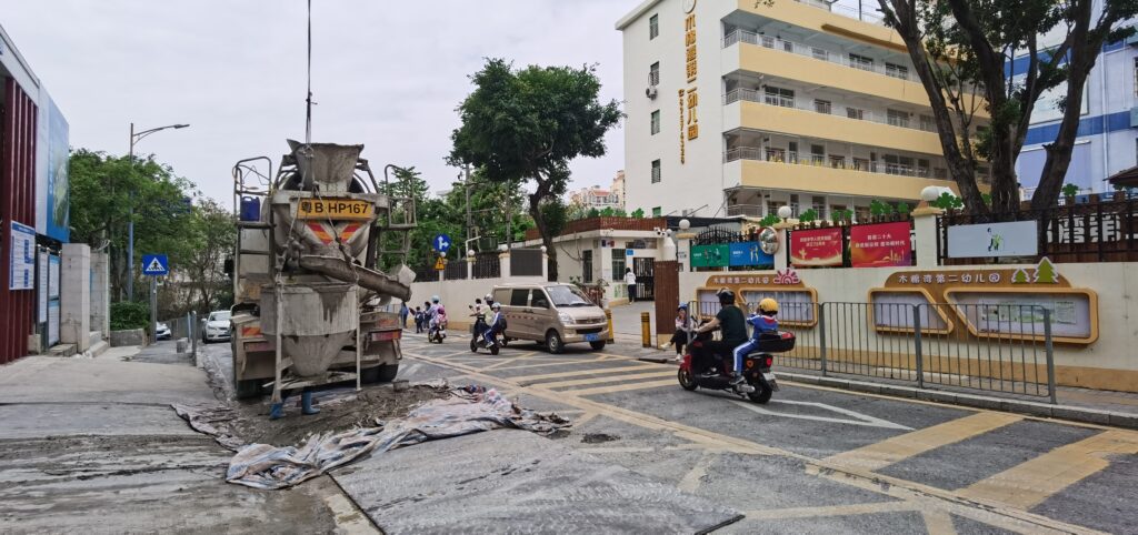 为民办事栏目调查了解到,木棉湾学校有小学、初中共计2600余学生。现场混凝土搅拌车占道对面约10余米距离,正是深圳市龙岗区布吉街道木棉湾第二幼儿园。