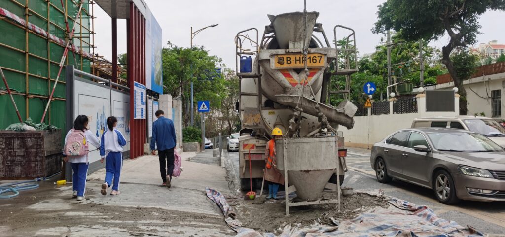 不少家长反映,学生上下学期间路过此搅拌车占道施工现场,存在高空作业砸人、砂石泥浆迸溅伤人等安全隐患。