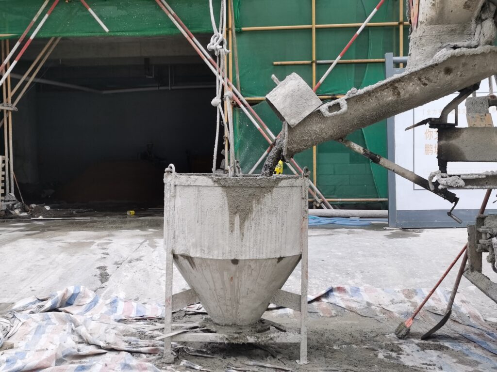 图说:现场占道搅拌车将泥浆倒入吊桶,然后高空运回工地内部。