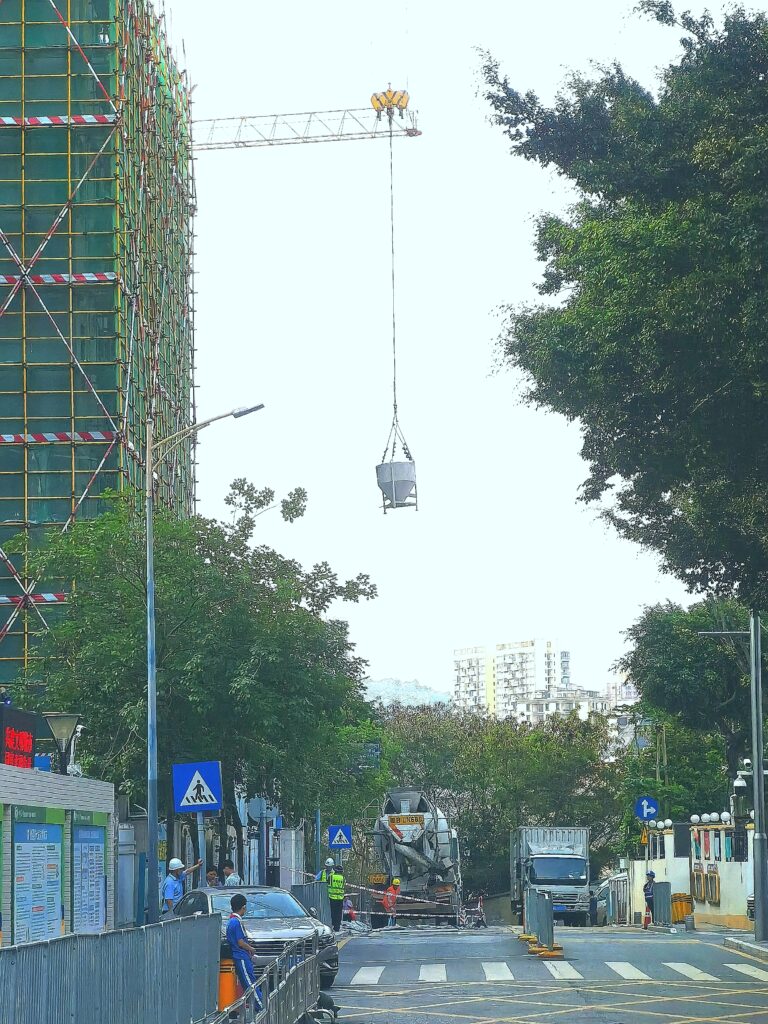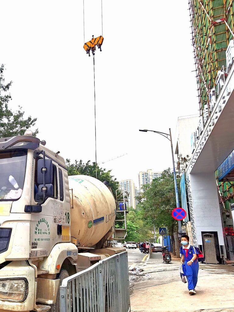 图说:学校路边占道搅拌车上空,吊桶正来回作业。