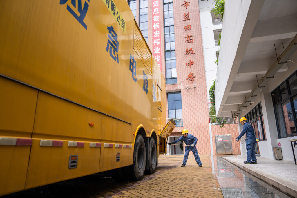 图说:南方电网深圳供电局在高考考点深圳市盐田高级中学提前部署应急电源车,保障高考期间的用电安全可靠。黄海鹏/摄影