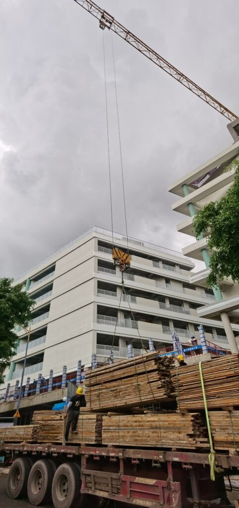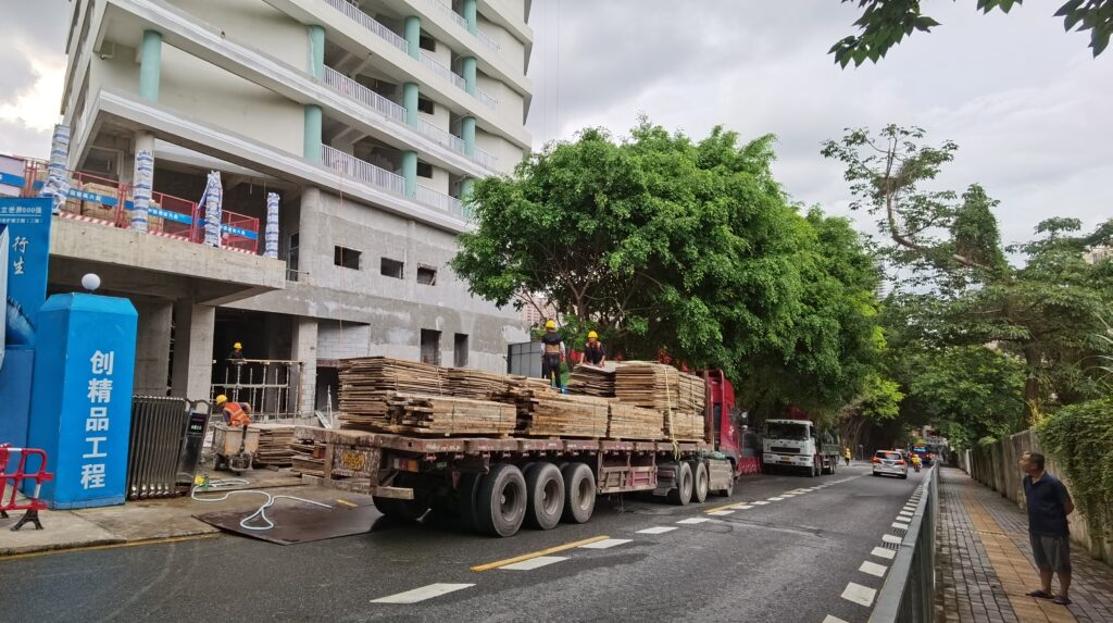 图说:工地门口,平板货车正在育苗路上卸货,伴随高空作业运输。