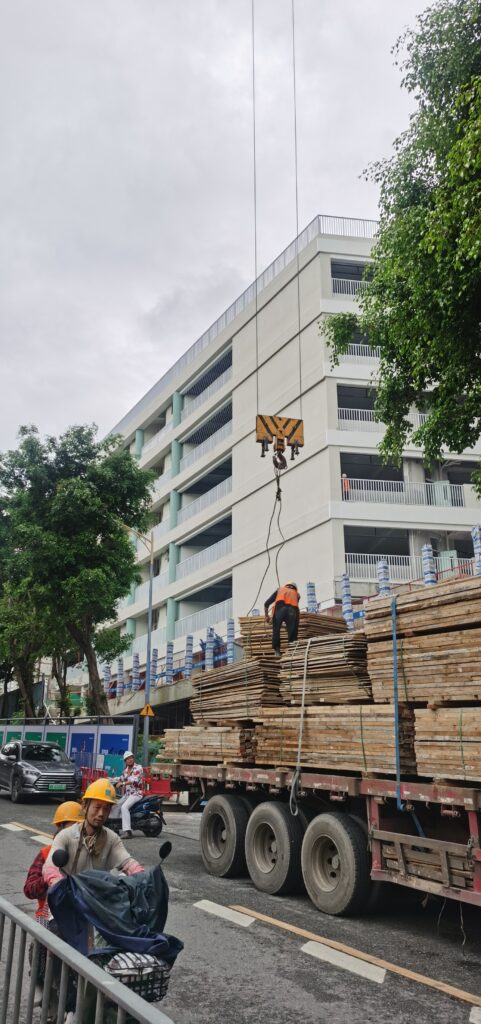 然而,一个月后家长再次反映:育苗路上涉事工地仍存在占道施工、卸货等行为。就此,为民办事栏目回访现场看到:之前在育苗路上、布吉街道木棉湾第二幼儿园大门对面的占道施工、卸货情况已经消失;但是在此路段向北数十米路边,确实存在家长所反映的情况:一辆十余米长的平板货车上,装满了建筑木材,停靠在育苗路机动车道上;其上塔吊机械臂垂下金属钩,将捆绑的木材吊起,高空作业运输到工地场地内。
